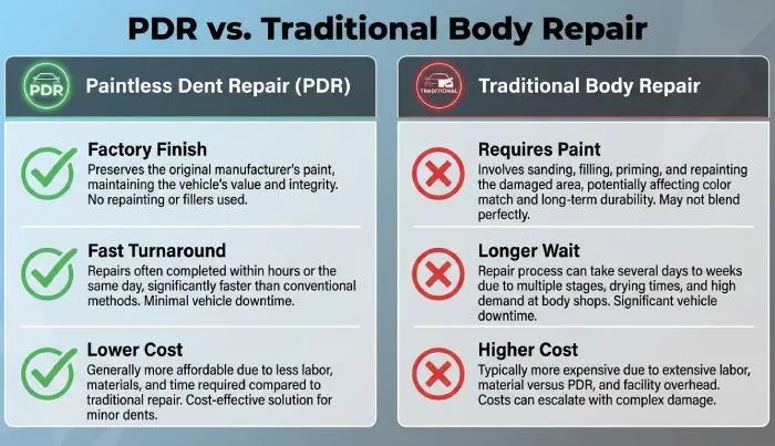 With paintless dent repair and paintless dent removal, there’s no repaint, so color match issues disappear and your factory finish stays intact. That means better resale potential, fewer materials, and affordable repair outcomes—often at a lower repair cost than conventional body work. Many family owned, local business teams stand behind their PDR processes with guaranteed repairs that help restore your dents and bring the exterior back to a pre-damage condition.